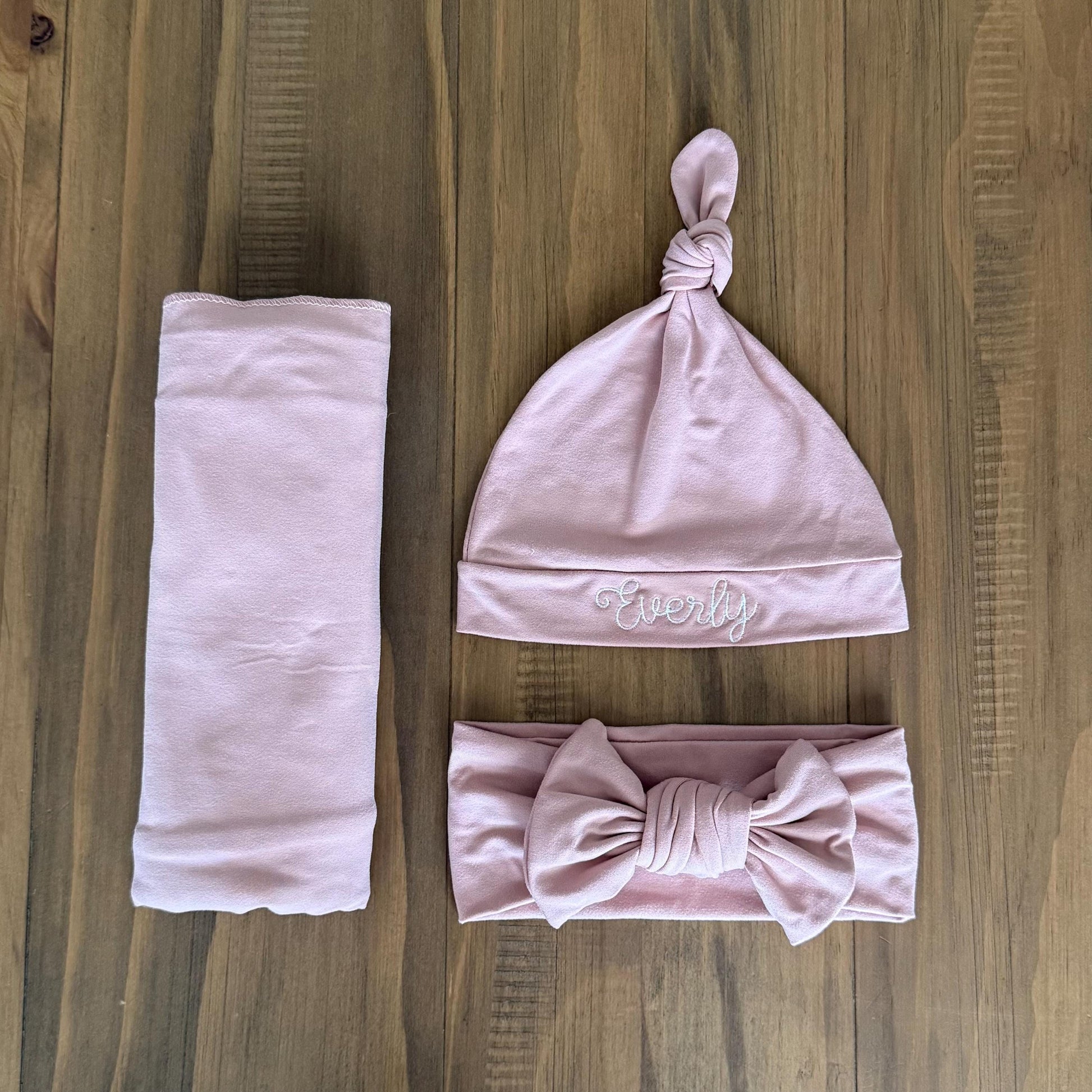 ✨ Personalized Newborn Swaddle, Headband, and Embroidered Hat Set – Custom Baby Shower Gift & Hospital Photo Outfit